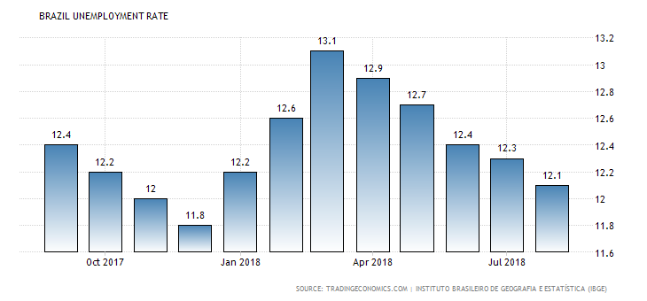 Brazil is still struggling to rid itself of the worst economic crisis that it has ever faced, and which resulted in a severe recession (reduction of almost 10% in per capita GDP, during 2015/6), with a timid recovery over the last two years. This was mostly caused by (i) a series of wrong economic policies; (ii) an unfavorable international environment; (iii) a massive public sector corruption scheme (at least USD 2 billion in deviated funds), which discredited the Government and (iv) an irresponsible populist fiscal policy, which led to a sizeable increase of public sector debt. The combination of these factors resulted in a severe political crisis. The uncertainty of the presidential election outcome also contributed to investments of the private sector remaining practically stopped. These combined factors led to a very high (and record) unemployment level –according to the Brazilian Geographic and Statistics Institute (IBGE), the unemployment rate at the end of August 2018 was still 12.1%, a slight reduction compared to the figures for the previous quarter. In absolute numbers, approximately 13 million people remain out of work.
